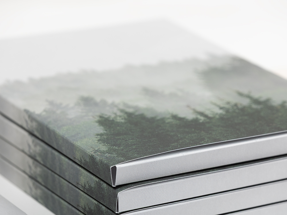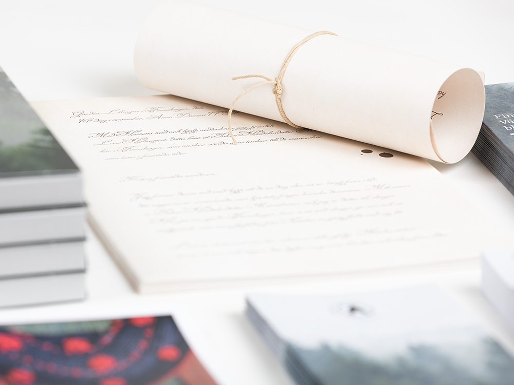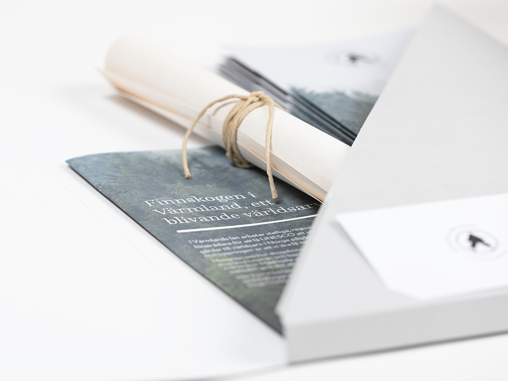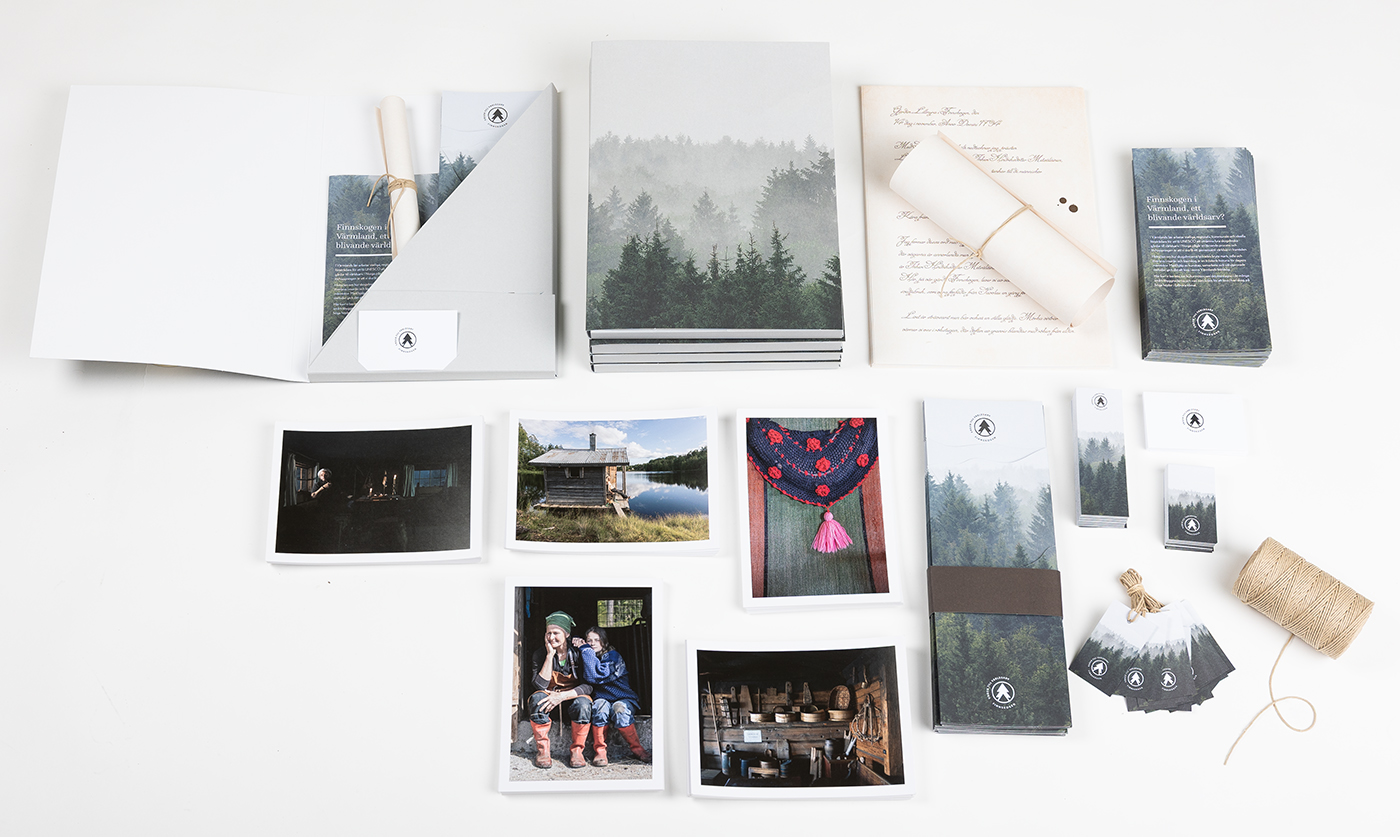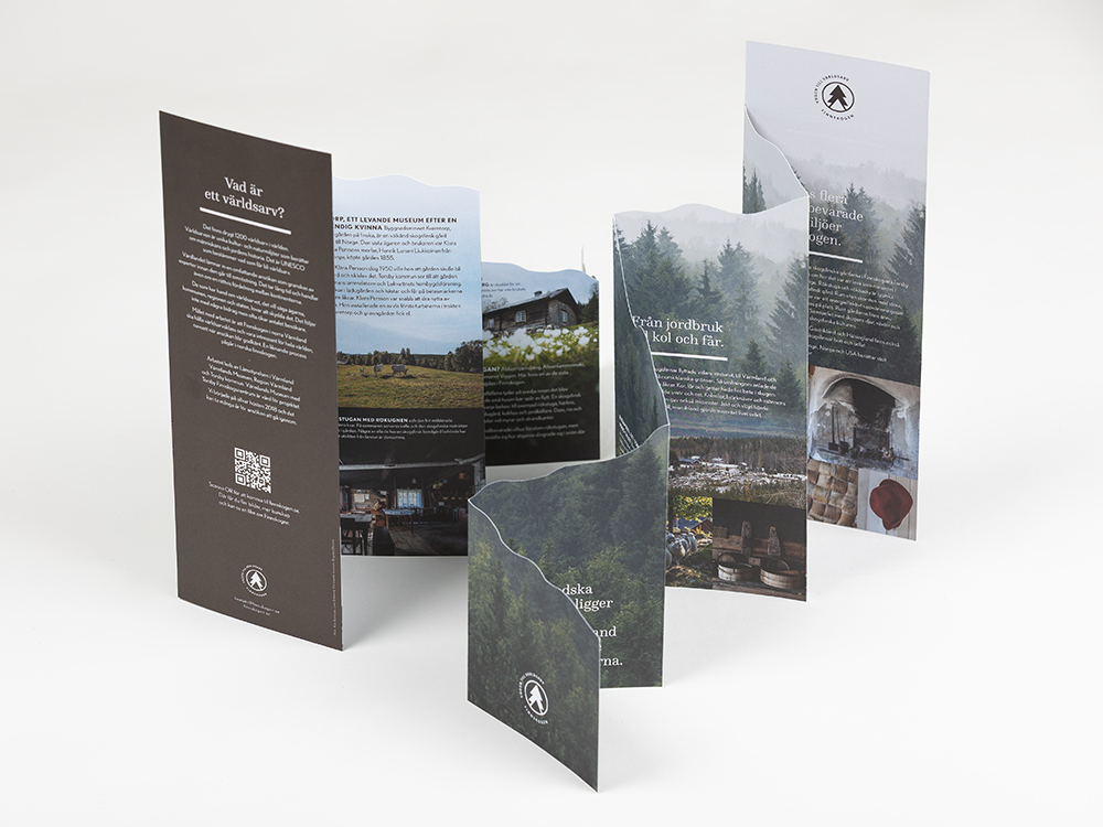 Samma tanke kom igen i en av foldrarna när den togs fram. Det är en 12-sidig vikfolder med en väldigt speciell stans. Så hur tänkte de som levde och bodde i Finnskogarna? Jo, ta vara på allt och ingenting är omöjligt… Så när foldern trycktes utnyttjade vi tryckspillet till roliga kort och annat. Vi placerade ut logotyper och lät bilderna fortsätta utanför folderns kant och lät tryckeriet leverera det bortstansade materialet. Ett bra sätt att spara resurser!